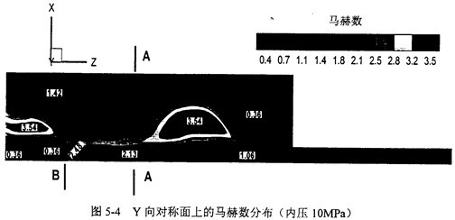 圖5-4給出了XZ對(duì)稱(chēng)面上的馬赫數(shù)分布。管道中的流動(dòng)在裂尖出口處達(dá)到超聲速,而在對(duì)稱(chēng)面附近發(fā)生了強(qiáng)烈的回流。標(biāo)示為B的位置壓力和密度發(fā)生了強(qiáng)間斷,意味著出現(xiàn)了激波。