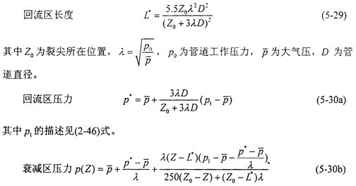 其三是衰減區(qū)的壓力變化。氣流通過(guò)裂紋尖端時(shí),管壁上作用的氣體壓力沿軸向迅速衰減,經(jīng)驗(yàn)公式(2-47)中所用的衰減長(zhǎng)度一般取為1.5倍管道直徑,最終衰減到零。計(jì)算表明衰減長(zhǎng)度隨管道工作壓力的升高而增加,并且衰減區(qū)壓力的最低值與管道的工作壓力相關(guān)。由于對(duì)裂紋的擴(kuò)展?fàn)顟B(tài)影響甚微,裂尖前部的壓力不是關(guān)心的對(duì)象。