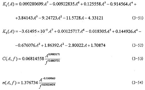 然后用線性參數(shù)辨識(shí)法和非線性參數(shù)辨識(shí)法,根據(jù)上面已經(jīng)得到的各個(gè)工況下K1(A),K3(A),K5(A),C(A,f)和n(A,f)的數(shù)值對(duì)(3-48)、(3-49)、(3-50)式中各參數(shù)進(jìn)行辨識(shí),將辨識(shí)得到各參數(shù)代入(3-48)、(3-49)和(3-50)式得: