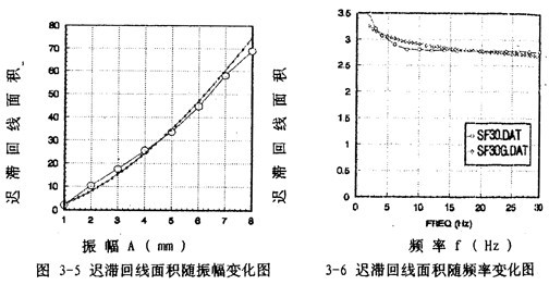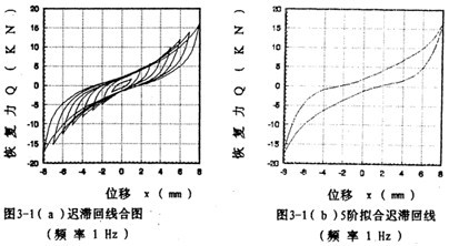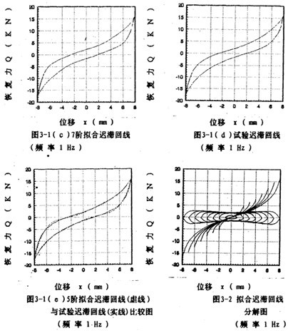為了說(shuō)明5階和7階冪函數(shù)多項(xiàng)式擬合的精度情況,以振幅A=8毫米,頻率為1赫茲為例,畫(huà)出擬合回線分別如圖3-1(b)、3-1(c)所示,將它們與對(duì)應(yīng)試驗(yàn)回線圖3-1(d)比較,可知7階擬合精度高于5階。圖3-1(e)為圖3-1(b)與圖3-1(d)的合圖。