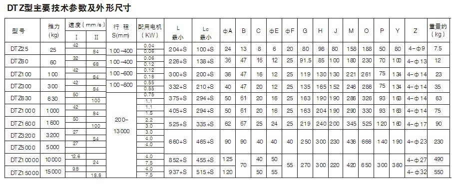 電動推桿按額定推力目前分為25、100、300、500、700、1000、1600、3200、5000、10000、20000、30000公斤等12個等級,按行程為100、200、300、400、500、600、700、800、900、1000、1100、1200、1300毫米,每種行程又有42或84,50或100,26.6或53.2兩種速度。