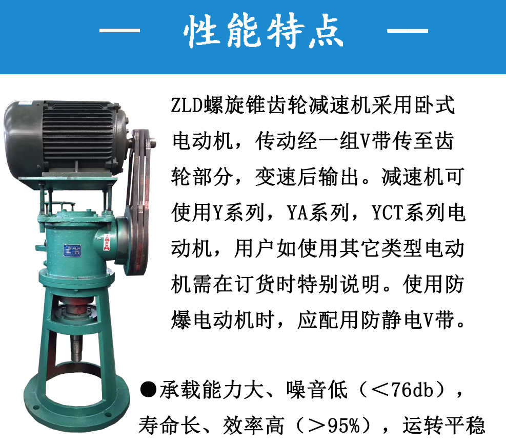 ZLD螺旋錐齒輪減速機(jī)采用臥式電動(dòng)機(jī),傳動(dòng)經(jīng)一組V帶傳至齒輪部分,變速后輸出。